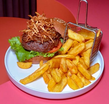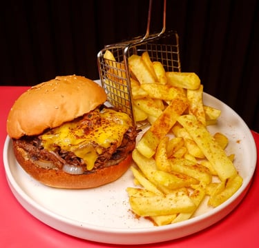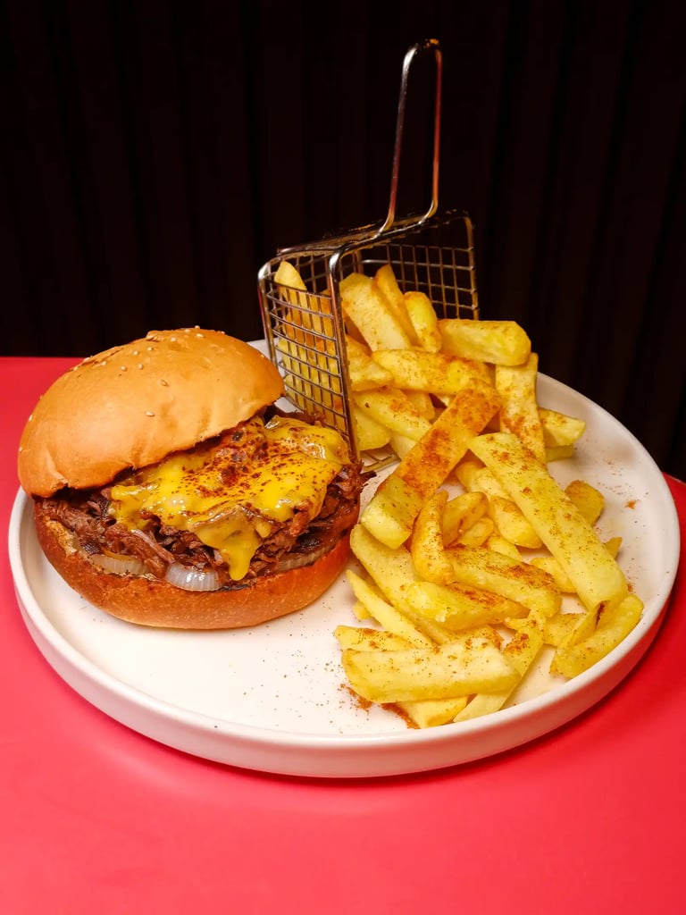 360 gr Dana köfte, Marul, Domates, Turşu, Cheddar peyniri, Karamelize soğan, Kibrit patates, Kaşık patates