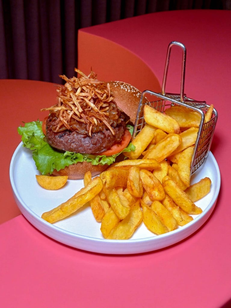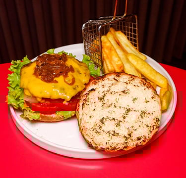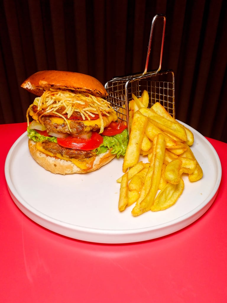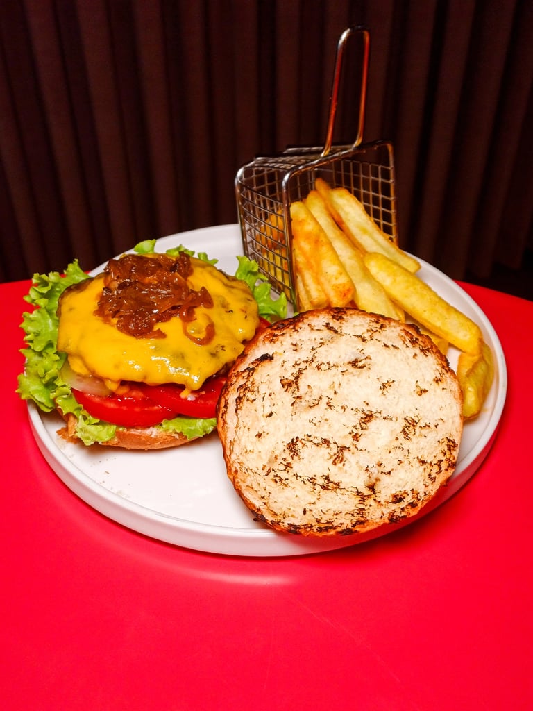 180 gr Dana köfte, Marul, Domates, Turşu, Cheddar peyniri, Karamelize soğan, Kaşık patates
