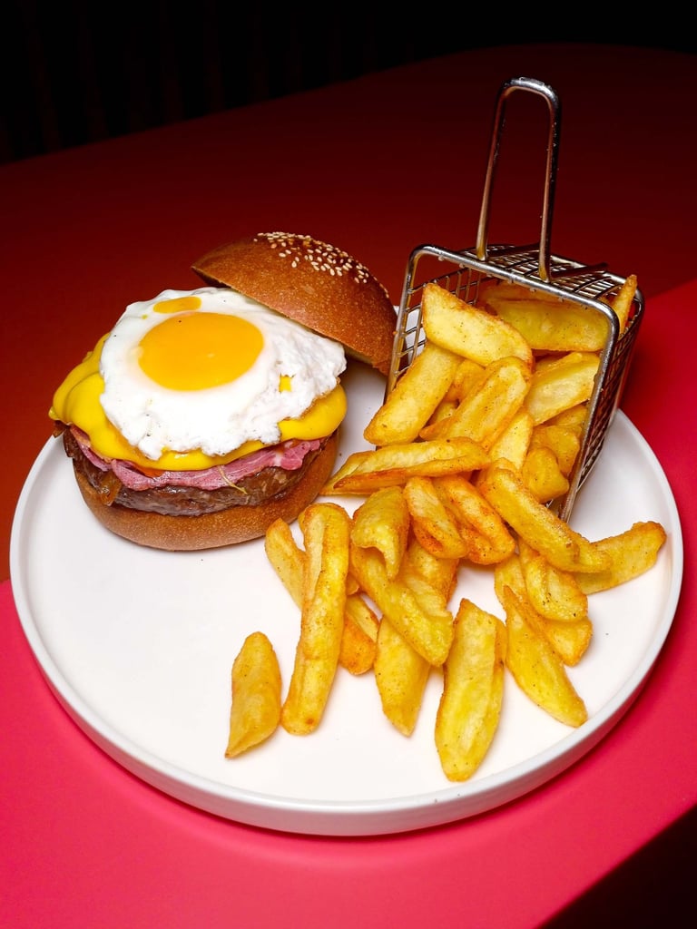 180 gr dana köfte, dana bacon, karamelize soğan, poşe yumurta, cheddar sos ve yanında kaşık patates