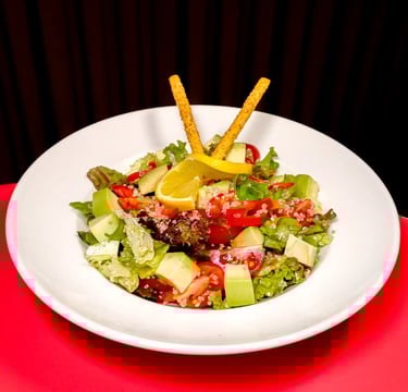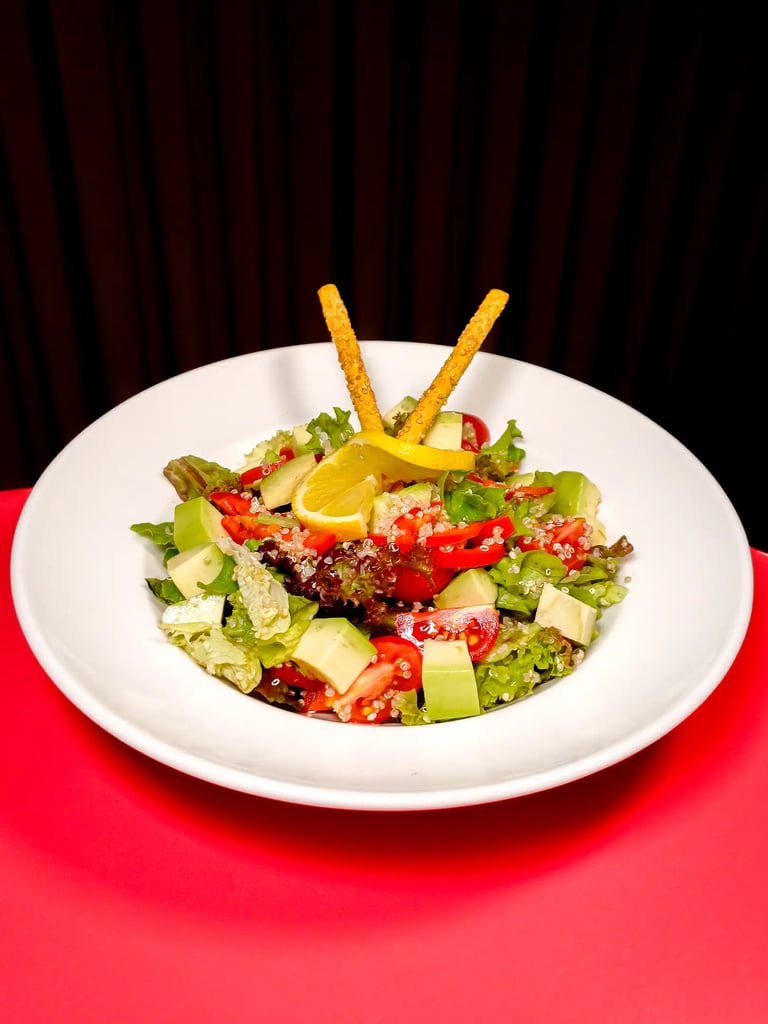 Kinoa, avokado, Taze yeşillikleri, közlenmiş kapya biber, hardal sos, cherry domates