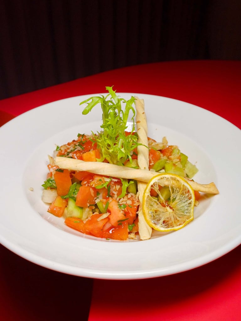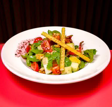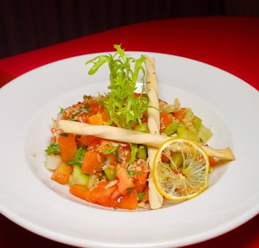 Domates, salatalık, çarliston biber, kırmızı soğan, maydanoz, nar ekşisi sos