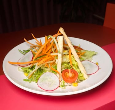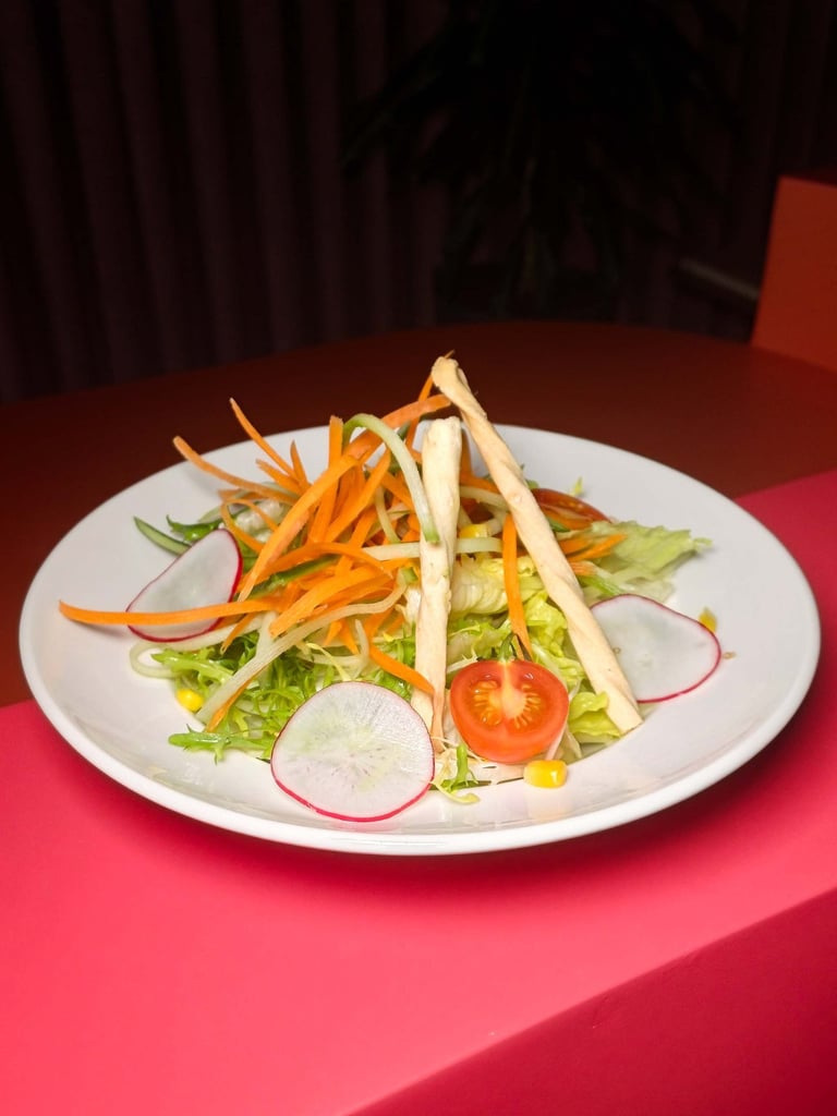 Iceberg marul, havuç, turp, çeri domates, salatalık, tane mısır, ballı hardallı portakal sos
