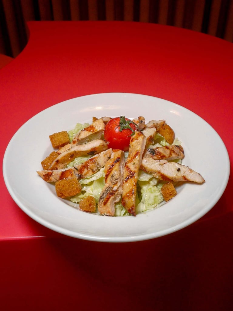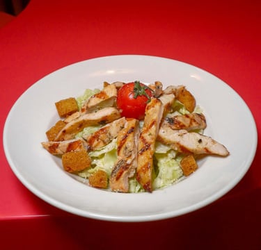 Izgara tavuk bonfile, kraton ekmek, sezar sos, ıceberg marul, parmesan.