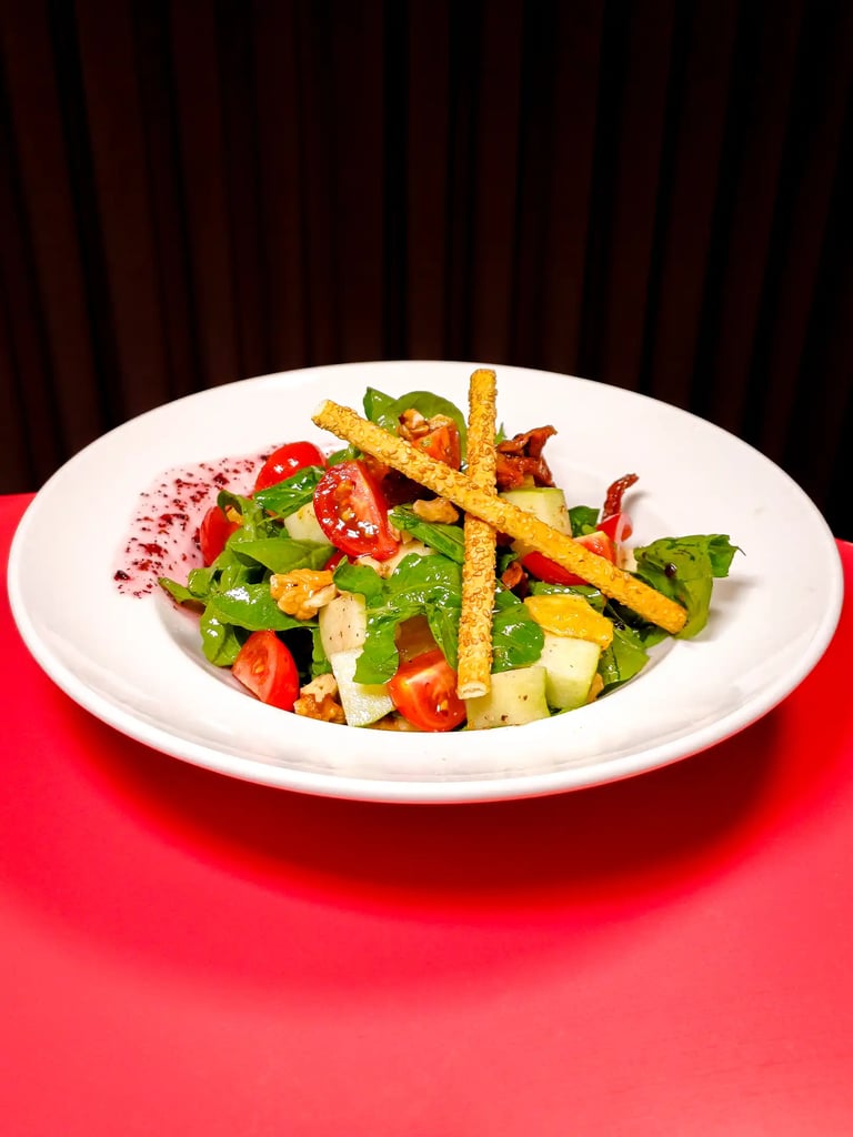Körpe roka yaprakları, Bergama tulumu, Cherry domates, ceviz, yeşil elma, portakal dilimleri,sour sauce